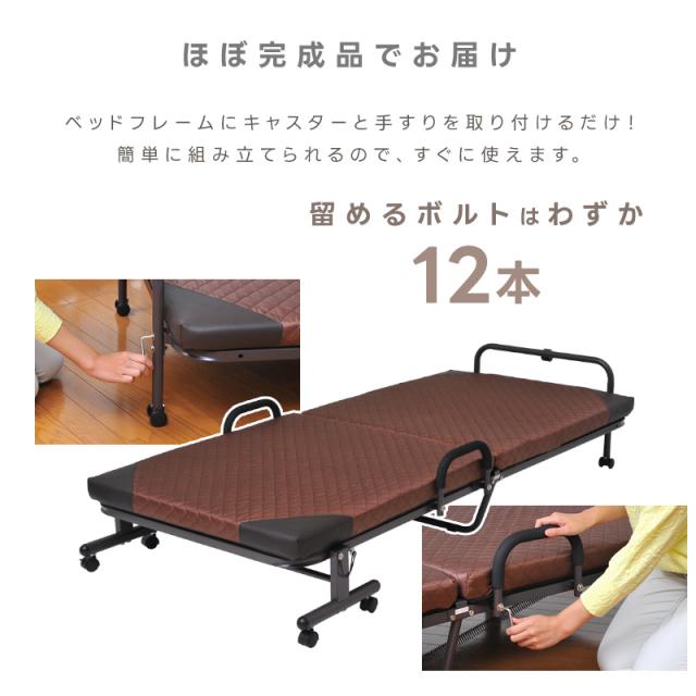 - キャスターと持ち手部分の取り付けだけで簡単に使えたので良かった。 ベッド下のスペースを使いたかったのですが、バネの露出部分が多く端の方にしか物が置かなかったのだけ少し残念……折りたたみ式なので仕方のな...