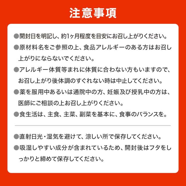 | ●開封日を明記し、約一ヶ月程度を目安にお召し上がりください。 ●原材料名をご参照の上、食品アレルギーのある方はお召し上がりにならないでください。 ●アレルギー体質等まれに体質に合わない方もいますので、お召し上がり後体調のすぐれない時は中止してください。 ●薬を服用中あるいは通院中の方、妊娠及び授乳中の方は、医師にご相談の上お召し上がりください。 ●食生活は、主食、主菜、副菜を基本に、食事のバランスを。 |