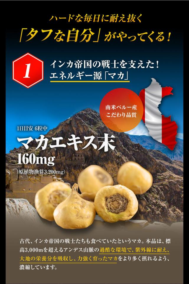 標高3,000mを超えるアンデス山脈の過酷な環境で、紫外線に耐え、大地の栄養分を吸収し、力強く育ったマカを中心に、東洋の高麗人参、タイのクラチャイダム、アマゾンのムイラプアマを厳選配合しました。毎日の活力や頑張り、若々しさや美しさを求める方にお勧めです。