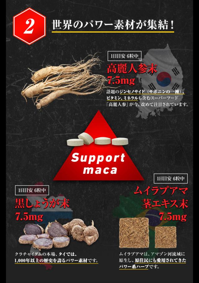 | マカエキス末:160mg(原植物換算3,200mg)、高麗人参末:7.5mg、ムイラプアマ茎エキス末:7.5mg、黒ショウガ(クラチャイダム)末:7.5mg |