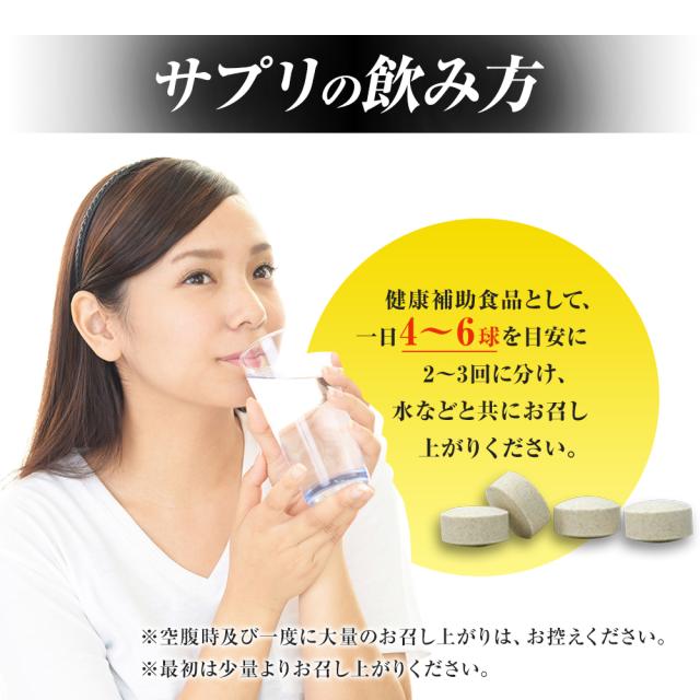 | ●健康補助食品として、一日4〜6粒を目安に、2〜3回に分け、水などと共にお召し上がりください。 ●空腹時及び一度に大量のお召し上がりは、お控えください。 ●最初は少量よりお召し上がりください。 |