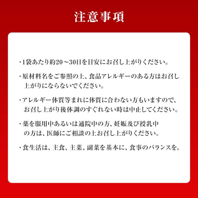 | ●約20〜30日を目安にお召し上がりください。 ●原材料名をご参照の上、食品アレルギーのある方はお召し上がりにならないでください。 ●アレルギー体質等まれに体質に合わない方もいますので、お召し上がり後体調のすぐれない時は中止してください。 ●薬を服用中あるいは通院中の方、妊娠及び授乳中の方は、医師にご相談の上お召し上がりください。 ●食生活は、主食、主菜、副菜を基本に、食事のバランスを。 |