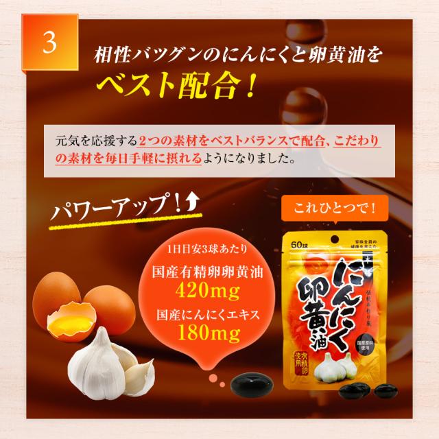 | 国産有精卵卵黄油:420mg、国産にんにくエキス:180mg |