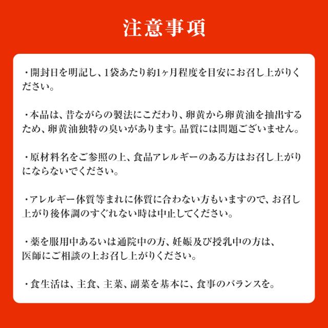 | ●開封日を明記し、約一ヶ月程度を目安にお召し上がりください。 ●本品は、昔ながらの製法にこだわり、卵黄から卵黄油を抽出するため、卵黄油独特の臭いがあります。品質には問題ございません。 ●成分表示をご参照の上、食品アレルギーのある方はお召し上がりにならないでください。 ●アレルギー体質等まれに体質に合わない方もいますので、お召し上がり後体調のすぐれない時は中止してください。 ●薬を服用中あるいは通院中の方、妊娠及び授乳中の方は、医師にご相談の上お召し上がりください。 ●食生活は、主食、主菜、副菜を基本に、食事のバランスを。 |
