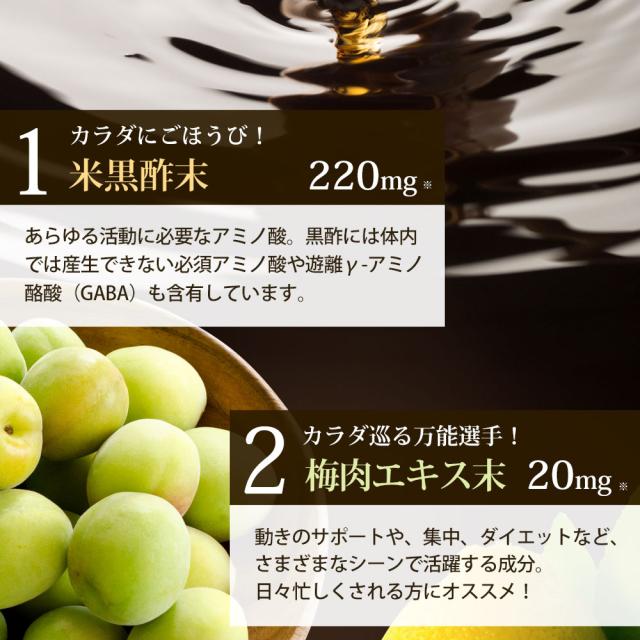 本品は古来伝承の玄米黒酢に体をリフレッシュするクエン酸とムメフラールで人気の梅肉エキスを加え、すっぱさが気にならず飲みやすいカプセル状にしました。さらに、携帯にも便利なスタンドパックタイプです。