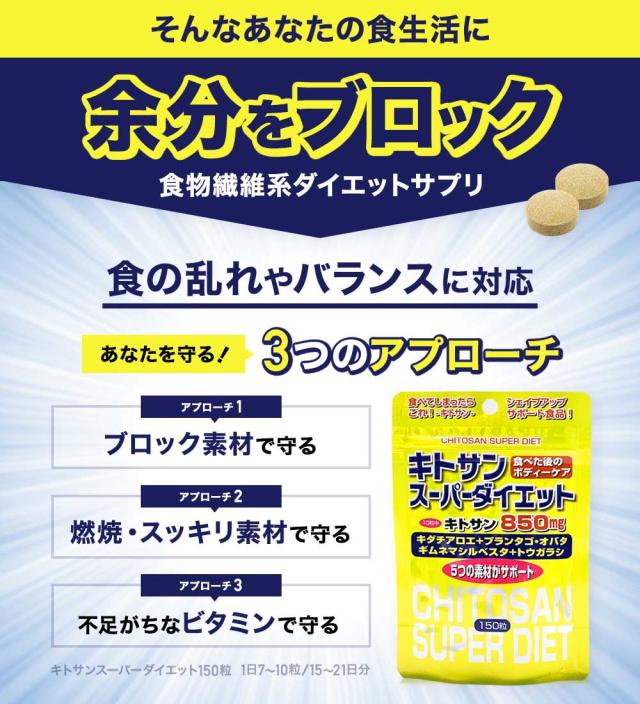 訳あり キトサンスーパーダイエット 150粒 約15〜21日分 賞味期限2027年3月以降 送料無料 メール便 | ダイエット サプリ サプリメント ダイエット食品 ダイエットサプリメント 男性 女性 食物繊維 キトサン 鉄分 ビタミンB ギムネマ エキス 粒 アウトレット