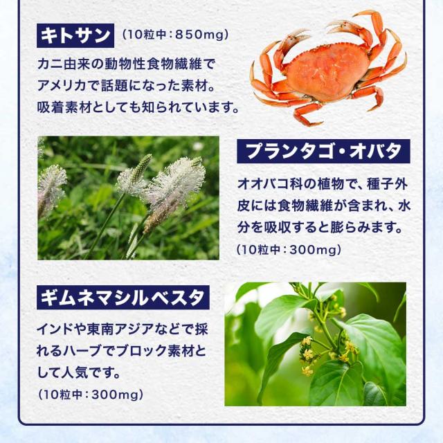 キトサンをメインにキダチアロエ・ギムネマシルベスタエキス・サイリウム・トウガラシエキスの5種類のダイエット素材をバランスよく配合しております。