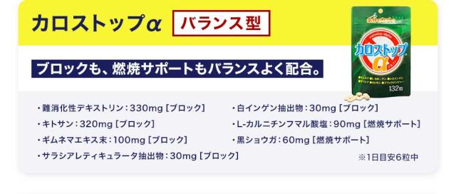 | 澱粉分解物(国内製造)、キダチアロエ末、ギムネマシルベスタエキス末、乳糖 / キトサン、ブランタゴ・オバタ末、香辛料(トウガラシエキス)、シェラック、微粒二酸化ケイ素、ステアリン酸Ca、HPC、ビタミンC、ビタミンE、ナイアシン、パントテン酸Ca、ビタミンB1、ビタミンB6、ビタミンB2、ビタミンA、葉酸、ビタミンD、ビタミンB12、(一部に乳成分・かにを含む) |