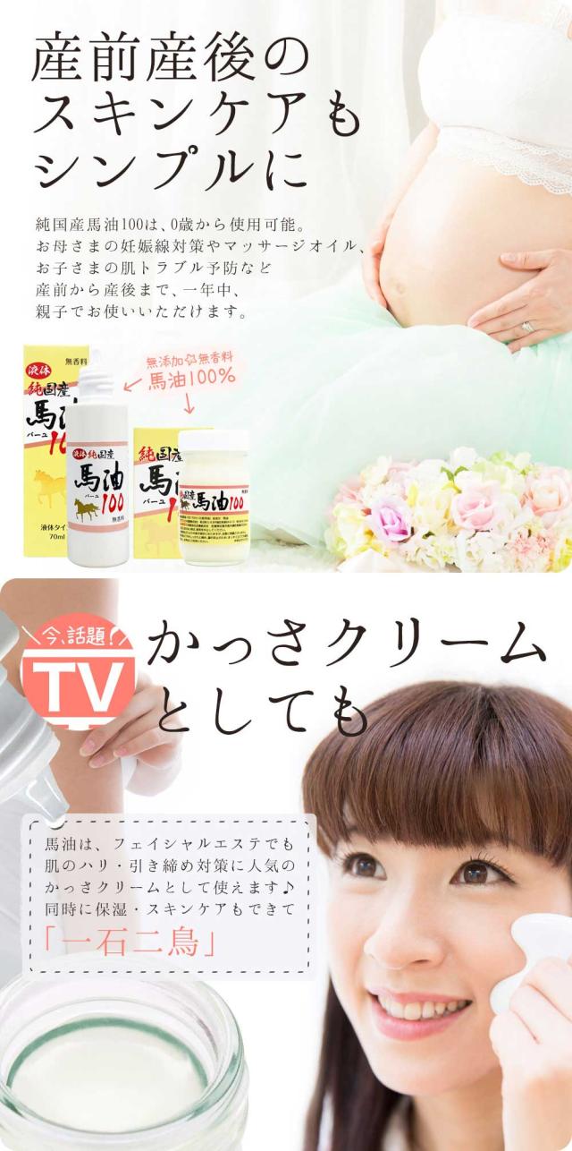 馬油は浸透性が高く、皮膚に潤いを与え、皮膚を保護させます。洗顔後や入浴後に塗布量を加減しながら身体全身にお使いいただけます。