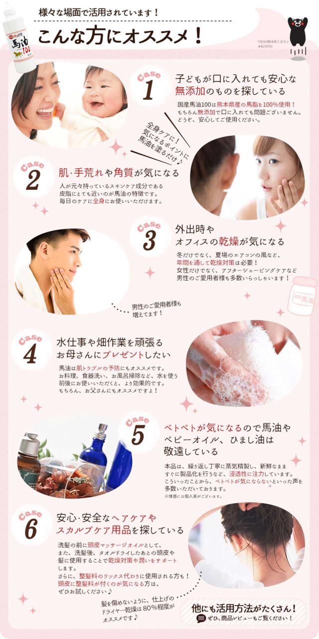 | ● 全身のお肌にお使いいただけます。洗顔 後や 入浴後に、 馬油 を適量手に取り、軽く マッサージ するようになじませてください。 ● 頭皮 や 肌 の 乾燥 が気になる方は、 シャンプー や ボディーソープ ・ 石鹸 の量を控え、入浴後に馬油を塗り、ドライヤー 乾燥 は80%程度にしてください。 ● 髪 の 艶 や コシ が気になる方は、 トリートメント に 馬油 を混ぜて使うのも オススメ です。 ● 手荒れ 対策 には 馬油 を たっぷり塗ったあとで 手袋 を、 足裏の カサカサ には、 馬油 を塗ったあとで靴下を履く 簡単 パック がお手軽です。 |