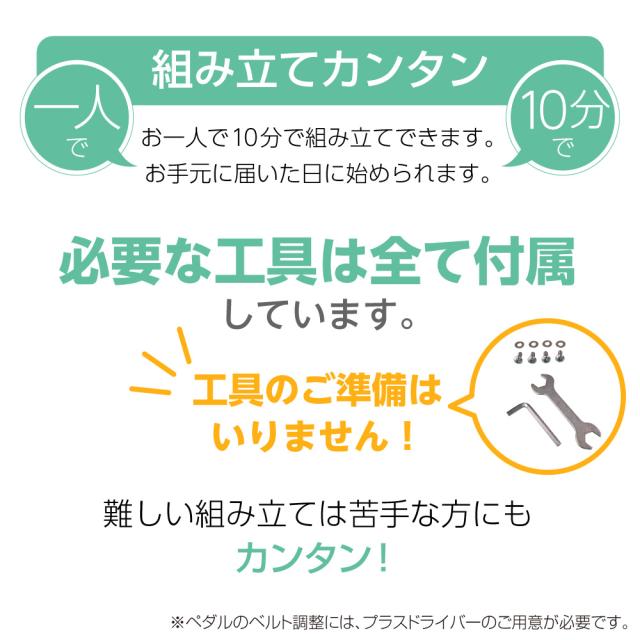 ベルトの長さは4段階に調節可能。※ペダルのベルト調整には、マイナスドライバーをご用意ください。