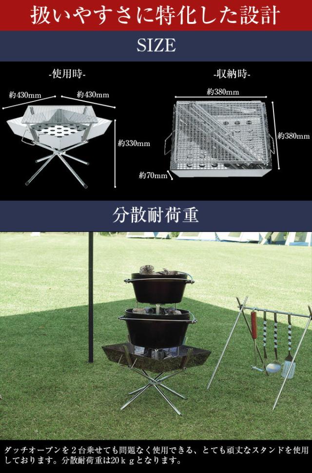 - 各メーカー悩みましたが、ダッチオーブンが載せられて、機能性、見た目が良いものと考えると、これしかないですね。 これが人気になるのは当然です。
