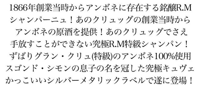 入手困難!蔵出しシャンパーニュ愛好家垂涎!長年の交渉の末、奇跡の日本初輸入!アンボネで1866年創業の歴史ある造り手!ドメーヌはエグリ・ウーリエの真向かいにあり、当主のジャン・リュック氏とフランソワ・エグリ氏は大親友!あの高級シャンパン“クリュッグ”が創業以来絶対手放さないアンボネ原酒の供給者!畑はすべてグラン・クリュのアンボネ100%!ピノ・ノワールもシャルドネもすべて樹齢35〜40年のヴィエイユ・ヴィーニュ!自然派リュット・レゾネで区画ごとに醸造されマロ発酵!ミレジメを除くシャンパンに約10〜50%のヴァン・ド・レゼルヴ983年以来毎年20%を足している「秘伝のタレ」のようなものをブレンド。生産分は全ての販売先が決まっているため非常に入手困難なR.M(N.M)シャンパーニュ!息子ニコラの名である“N”を冠したキュヴェが販売数ヶ月前のセラー蔵出しで限定入荷!
