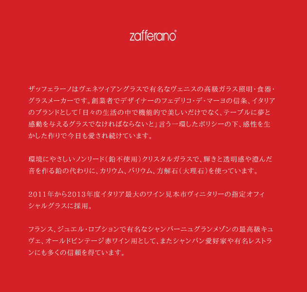 ザッフェラーノはヴェネツィアングラスで有名なヴェニスの高級ガラス照明・食器・グラスメーカーです。創業者でデザイナーのフェデリコ・デ・マーヨの信条、イタリアのブランドとして「日々の生活の中で機能的で美しいだけでなく、テーブルに夢と感動を与えるグラスでなければならない」と言う一貫したポリシーのもと、感性を活かした造りで今日も愛され続けています。環境に優しいノンリード(鉛不使用)クリスタルガラスで、輝きと透明感や澄んだ音をつくる鉛の代わりに、カリウム、バリウム、方解石(大理石)を使っています。2011〜2013年度イタリア最大のワイン見本市、VINITALY(ヴィニタリー)の指定オフィシャルグラスに採用の実績。ジョエル・ロブションで有名なシャンパーニュ・グラン・メゾンの最高級キュヴェや、オールドヴィンテージ・シャンパーニュ用のグラスとして、また高級オールドヴィンテージ赤ワイン用として、シャンパーニュ愛好家や有名レストランにも多くの信頼を得ています。