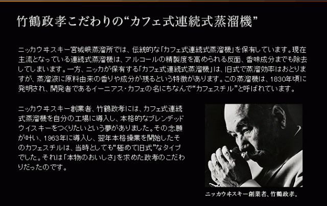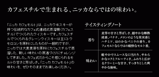 国産ウイスキー愛好家大注目!ニッカウヰスキー宮城峡蒸留所では、世界でも希少となったニッカウヰスキー伝統の“カフェ式連続式蒸留機”でウイスキー造りが行われています。カフェスチルで作られるグレーンウイスキーは主にトウモロコシを原料にしたものが一般的ですが、ニッカでは大麦麦芽を原料にカフェスチルで蒸留した新しい味わいの原酒づくりにチャレンジしてきました。カフェ式だからこそ感じられるモルトの甘さと芳ばしさ!琥珀カラー。甘さと芳ばしさ、穏やかな樽熟成香!バナナ、メロンのような果実香とハチミツ、ほのかなバニラといった甘いアロマ。カフェモルトならではの軽快なモルト香!軽やかでスムースな口当たりでやわらかなコクとフルーティーさ、ふわりと広がるクリーミーな甘さ。すっきりとした爽やかな余韻が続くカフェモルト!カフェ式だからこそ感じるモルトの甘さ、芳ばしさ!ぜひ一度ご賞味ください。