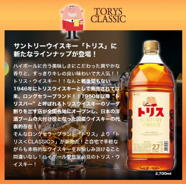 ウイスキーファン必見!!ハイボール愛飲家必見!!ハイボールに合う美味しさにこだわった爽やかな香りと、すっきりキレの良い味わいで大人気!!トリス・ウイスキー!!なんと戦後間もない1946年にトリスウイスキーとして発売されて以来、ロングセラーブランド!!1950年以降“トリスバー”と呼ばれるトリスウイスキーのソーダ割りを出す店が全国各地にオープンし、日本の洋酒ブームの火付け役となった国産ウイスキーの代表的存在!!そんなロングセラーブランド「トリス」より、「トリス<CLASSIC>」の2.7Lペットボトルが新発売!ご自宅で手軽ながらも本格的なウイスキーをお愉しみ頂けること間違いなし!ハイボール愛飲家必見のトリス・ウイスキー!!ぜひご賞味下さい!!