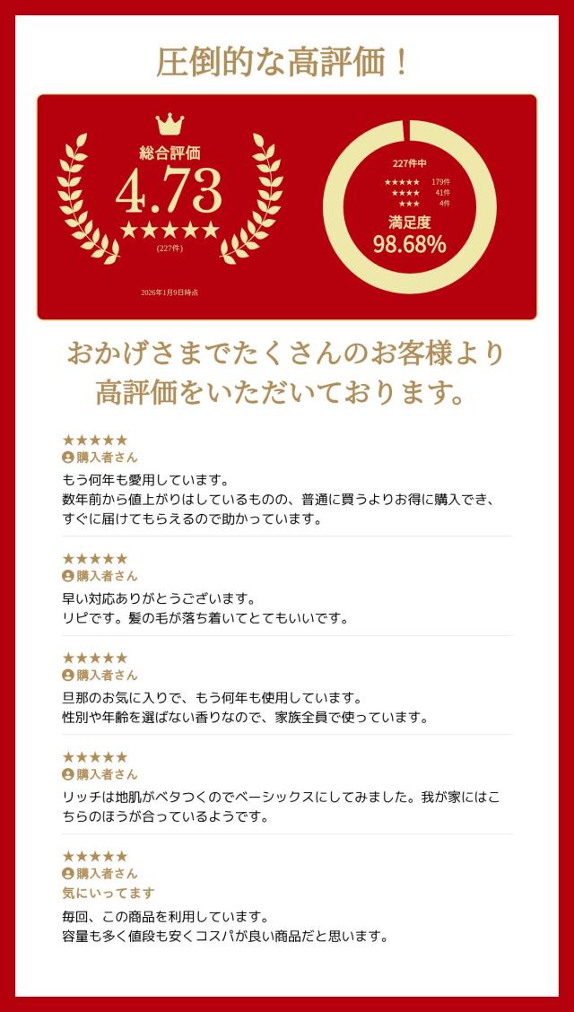 - 何度もリピートしています。 髪の痛みが酷くなり、色んなメーカーの製品を試しましたが、一番しっくりきました。 ほのかな香りとドライヤー後の仕上がりがとても気に入ってます。