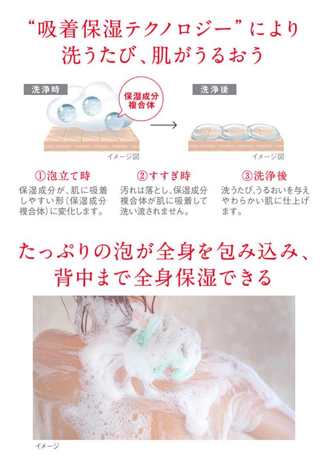 ●「吸着保湿 テクノロジー」で保湿成分が肌にしっかり吸着。汚れは落とし、洗うたび全身にうるおいを与えやわらかい肌に。