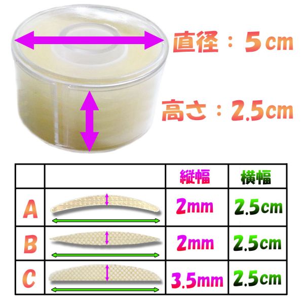 ■商品詳細 ■商品名 二重アイテープ片面タイプ ■内容物 二重アイテープ片面タイプ1個(600枚) プッシャー ■色/形状 ・ライトブラウン(濃い肌色)/TypeA(底辺カーブ型) ・ライトブラウン(濃い肌色)/TypeB(上下対称型) ・ライトブラウン(濃い肌色)/TypeC(底辺直線型) ・アイボリー(薄い肌色)/TypeA(底辺カーブ型) ・アイボリー(薄い肌色)/TypeB(上下対称型) ・アイボリー(薄い肌色)/TypeC(底辺直線型) ※画像「形状と色」も合わせてご確認ください。 ■タイプ 片面接着タイプ ■注意事項 ・お肌の弱い方は、パッチテストをおススメいたします。 ・かぶれ等が生じた場合はただちに使用を中止し、医師にご相談ください。 ・こちらは伸びるタイプのテープではございません。 ・プッシャーご利用の際は目に入らない様、十分気をつけてご利用下さい。 ・ご使用の際は、お使いになる分だけロールテープを引き出して下さい。 一度に長く引き出してしまうと、アイテープが剥がれてしまう恐れがあります。 |