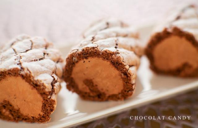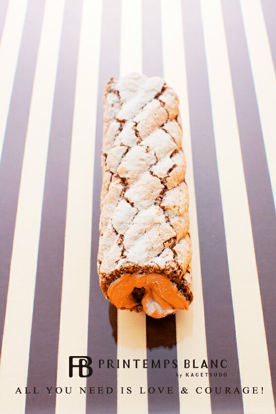 | 外は独自製法でサクサク中はしっとりバンホーテンのココアがたっぷり入った生地です。さらにガナッシュが入った生クリームがあふれんばかり巻かれています。