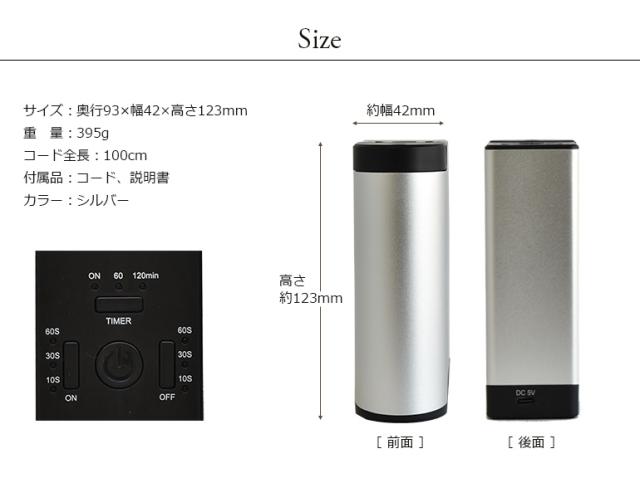 【特徴】水を使わない進化系ディフューザー。どんな空間にもなじむシンプルデザインで、直接オイルを空気微粒子に変換し、空気中に拡散することができるタイプです。余計な手間なく火の取り扱いを気にすることもなく手軽にアロマの香りを楽しめます。ポータブルなので、場所を選ばずお使いいただけます。当店のアロマ10mlと5mlのタイプならそのまま取り付け可能。【商品スペック】内容量:[セット内容]ディフューザー本体+10ml精油1本付き!サイズ:93×42×123mm重さ:395gその他:[お手入れに関して]粘性の高い精油を使用した場合は目詰まりの原因となる場合がございます。また、精油の成分が固形化して目詰まりとなる場合もございます。ご利用になる際は、粘性や凝固点に留意してご使用ください。また、長期間ご使用にならない場合は、ノズル内に残った精油が凝固したり、ホコリを固めたりすることによって目詰まりや故障の原因となる場合がございます。定期的にお手入れをしながら、ご利用ください。
