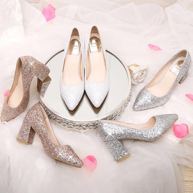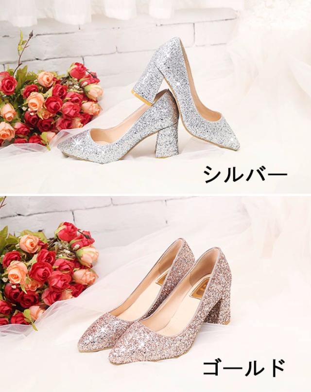 美脚パンプス ブライダルシューズ ハイヒール ローヒール ウェディングシューズ 結婚式 発表会 2次会 シルバー ゴールド ホワイト