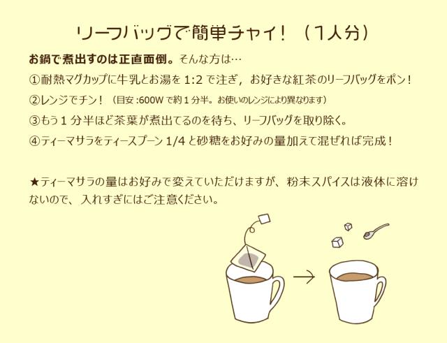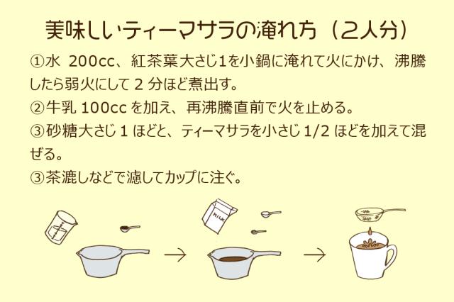 スパイス専門店がアッサム茶葉に合うように粉末状にしたカルダモン・ジンジャーなどスパイスをブレンド、少量まぜるだけで本格的なレストランのマサラチャイがご自宅でお楽しみ頂けます。