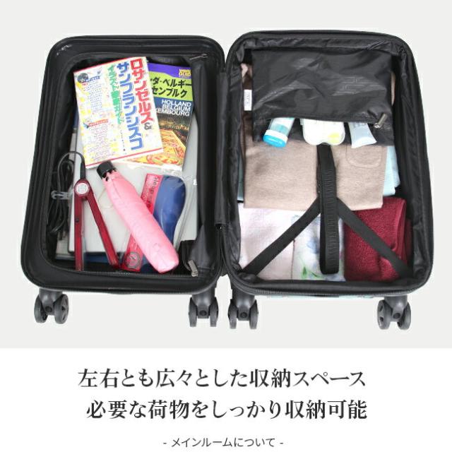 滞在目安3〜5泊程度で、国内線機内持ち込み可能サイズです。深さがあるのでたっぷり荷物を収納することが出来ます。右側は衣類押さえのクロスバンドを装備しており、バックル式で長さ調節が可能です。移動中に中で動いてしまいがちな洋服などを収納しても安心です。さらに上部にはファスナーポケットで開閉可能な備え付けポーチが付いていて、小物の収納にとても便利です。左側はファスナーで開閉するタイプになっています。