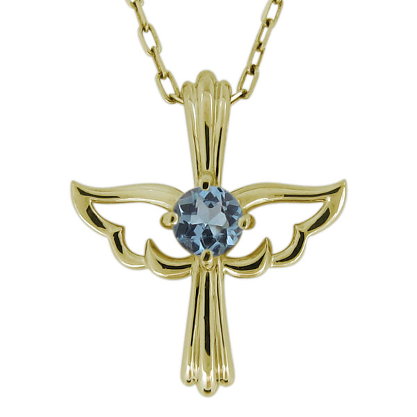 3月誕生石アクアマリンサンタマリアを使用した18金製の、羽根(フェザー)・クロスモチーフネックレス・ペンダントです。