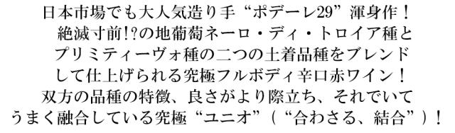 日本市場でも大人気造り手“ポデーレ29”渾身作! 絶滅寸前!?の地葡萄ネーロ・ディ・トロイア種と プリミティーヴォ種の二つの土着品種をブレンド して仕上げられる究極フルボディ辛口赤ワイン! 双方の品種の特徴、良さがより際立ち、それでいて うまく融合している究極“ユニオ”(“合わさる、結合”)!