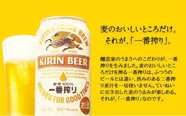 醸造家のうまさへのこだわりが、一番搾りを生みました。麦のおいしいところだけを搾る一番搾りは、ふつうのビールとは違い、渋みのある二番搾り麦汁を一切使いません。ていねいに引き出した麦のうまみが楽しめる。それが、「一番搾り」なのです。