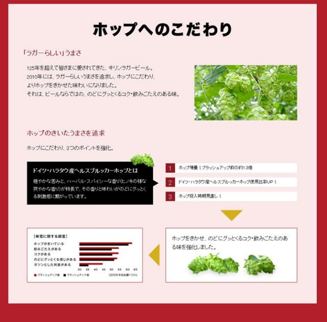 125年を超えて皆さまに愛されてきた、キリンラガービール。2010年には、ラガーらしいうまさを追求し、ホップにこだわり、よりホップをきかせた味わいになりました。それは、ビールならではの、のどにグッとくるコク・飲みごたえのある味。ホップ増量!ブラッシュアップ前の約1.3倍!ドイツ・ハラタウ産ヘルスブルッカーホップ使用比率UP!ホップ投入時期見直し!ドイツ・ハラタウ産ヘルスブルッカーホップとは穏やかな苦みと、ハーバル・スパイシーな香り(ヒノキの様な爽やかな香り)が特長で、その香りと味わいがのどにグッとくる刺激感に繋がっています。ホップをきかせ、のどにグッとくるコク・飲みごたえのある味を強化しました。