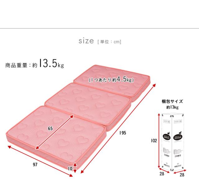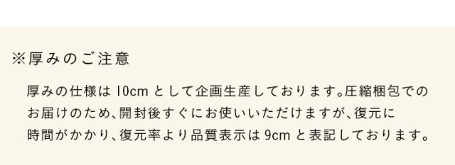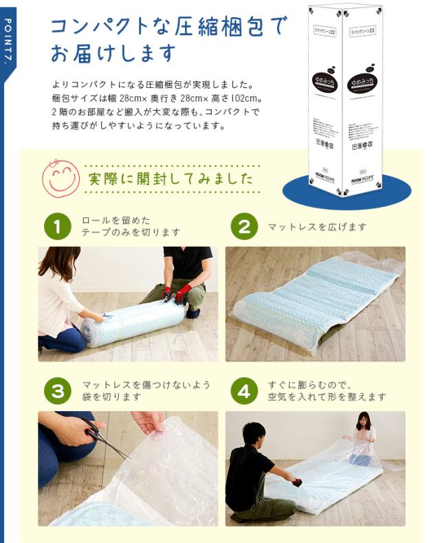 - 分厚目のマットレスが希望だったのですが、希望通りでした。圧縮されて届いたのですが、開けたら直ぐに膨らみ、夕方に届いて直ぐに使えました。3分割で1つが軽く、扱いやすかったです。