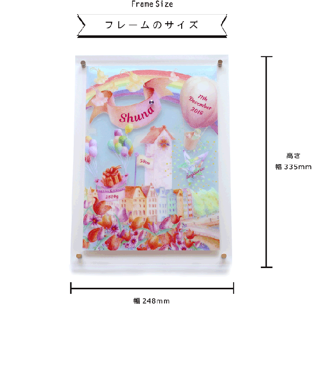 お名前や出生日時はもちろん、出生身長や体重、星座も可愛らしいイラストの中に閉じ込めました。