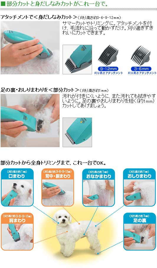 口まわりやお腹まわりなどの部分カットには、基本の刃を使用して刈り高さ1mmでカット。そして高さが3・6・9・12mmに調節できる「刈り高さアタッチメント」に付け替えることで、身だしなみのための全身のカットができます。刈り高さを調節して毛の流れに沿って動かすだけで、刈り過ぎずにキレイにカットできます。