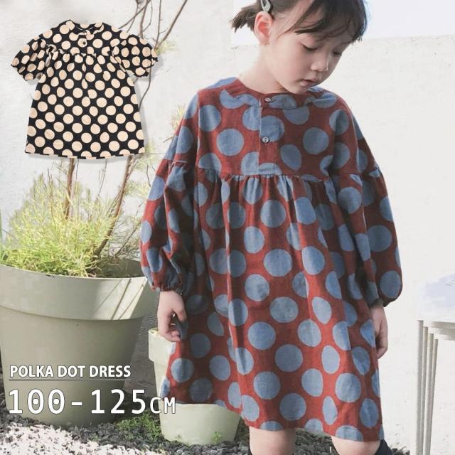 ワンピース 7分袖 ヘンリーネック 膝丈 ミディアム丈 ミディ丈 ドット柄 子供用 キッズ フレアスカート ウィンドカフス 水玉