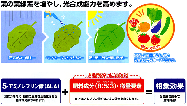 植物の光合成を高める5-アミノレブリン酸(ALA)を配合した液体肥料です。