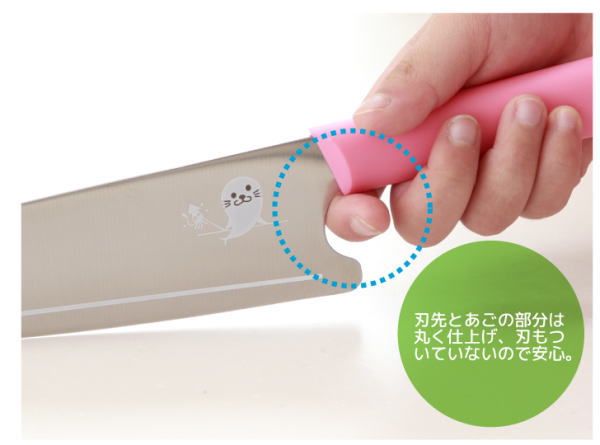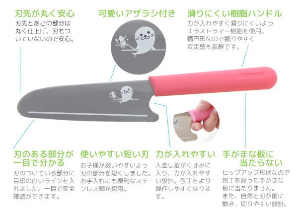 子供の手に合わせた、軽くて扱いやすいキッズ用包丁。先端を丸くし、刃の部分を短くするなど、安全性と使いやすさにこだわりました。無理な力をかけなくても切れるように、刃先の切れ味にもこだわったので、ママにも使いやすさ抜群です。可愛いアザラシのプリントがワンポイントです♪ ★刃先とあごの部分は丸く仕上げ、刃もついていないので安心。 ★ハンドルは力が入れやすく、滑りにくいようエラストラマー樹脂を使用。楕円形なので握りやすく安定感もあります。また、ヒップアップ形状なので包丁を握った手がまな板に当たりません。 ★お子様が扱いやすいよう刃の部分を短くしました。また、刃の着いている部分に目印の白いラインを入れたので一目で安全確認ができます。 ★人差し指がくぼみに入り、力が入れやすい設計。 ![]() ![]() ![]() ![]() ![]() ![]() ![]() ![]() ![]()