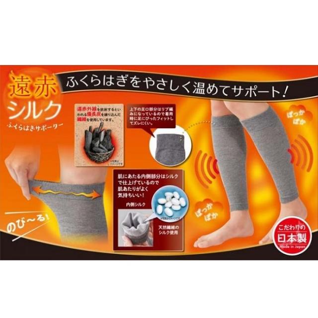 サポーターならこれ。ふくらはぎをやさしく温めてサポート。遠赤外線の放射性に優れた備長炭を練りこんだ繊維を使用しています。肌にあたる内側部分は天然繊維のシルク。肌あたりがよく気持ちいい。上下の足口部分はリブ編みになっていて、着用時に足にぴったりフィットしてズレにくい。こだわりの日本製。【商品名】遠赤シルクふくらはぎサポーター2枚組【原材料】絹、綿、その他【製造国】日本【個装サイズ】縦31cm奥行13.5cm横1cm【重量】58g【その他】ふくらはぎ回り:25-45cm 足首回り:20-35cm【注意事項】中性洗剤を使用してください。洗濯ネットを使用してください。アイロンは当て布をしてください。弱く絞る、もしくは短時間脱水してください。湿った状態で他の物とこすり合わせると色が移る恐れがあります。サポーター ふくらはぎ シルク あったか 冷え対策 冬 遠赤