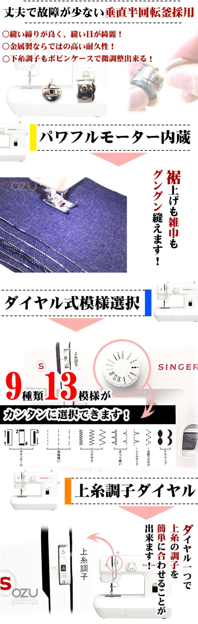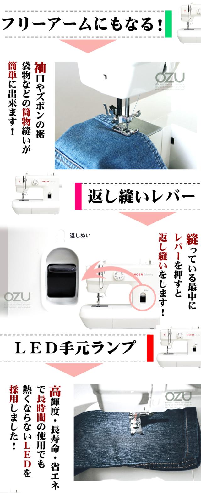 垂直半回転釜、フリーアーム、ダイヤル選択、厚物縫い、手元LEDランプ内蔵、軽量ポータブルタイプ