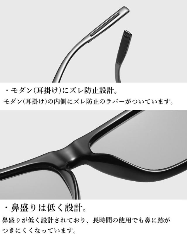 | ブラック/調光偏光スモーク ブラックガンメタル/調光偏光スモーク クリアグレーシルバー/調光偏光スモーク ブラック/調光偏光イエローブラウン ブラックガンメタル/調光偏光イエローブラウン クリアグレーシルバー/調光偏光イエローブラウン ブラウンデミ/調光偏光イエローブラウン | フレーム: プラスチック+合金 レンズ:プラスチック偏光 仕様 バネ蝶番、モダンズレ防止ラバー ※鼻盛りは低くなっています。 |