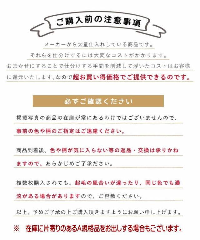 | ※必ず確認お願いします ●掲載している写真は一例となります。 ●衿付き・衿なし・両面プリント・無地カラーなど、色柄を含め様々なタイプの合わせ毛布です。 ※低価格のご提供のため、柄をご指定することはできません ●厚み・重さに個体差がある場合がございます。予めご了承下さい。 ※複数枚購入された場合、重さに差を感じることがございます。 ■ 掲載写真の商品の在庫が常にあるわけではございません。写真と異なる商品の場合がございます。 ■ こちらの商品は、織りキズや染色ミス、汚れ、縫製仕上げ不良などがB規格になった理由です。 通常の毛布の暖かさはA規格と同じで、使用上問題はございませんのでご安心してお使いいただけます。 ■ 商品のB規格の程度、形状、厚み、肌触りの程度が異なる場合がありますことをご了承ください。<br> ■在庫に片寄りのあるA規格品をお出しする場合もございます。 ■ 訳ありアウトレット商品のため、交換・返品はできません事をご了承ください。 |