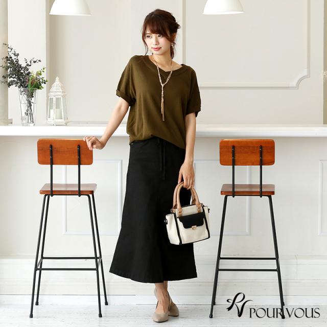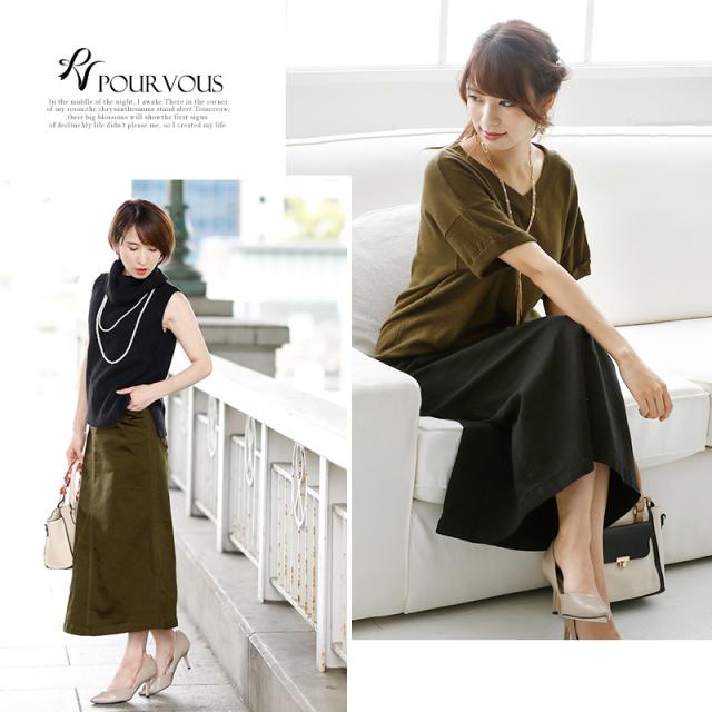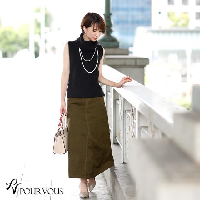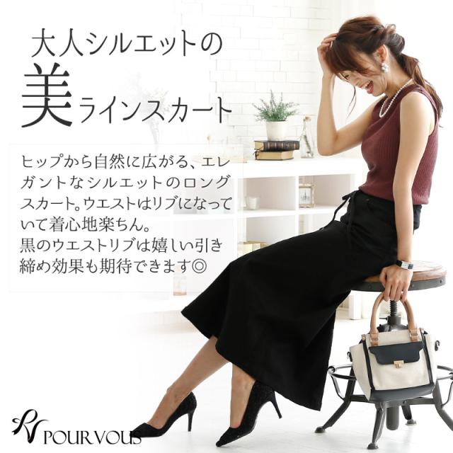 ★大人シルエットの美ラインスカートヒップから自然に広がる、エレガントなシルエットのロングスカート。ウエストはリブになっていて着心地楽ちん。黒のウエストリブは嬉しい引き締め効果も期待できます◎