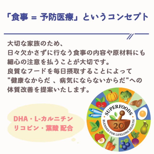 新鮮な野菜や果物をベースに、皮膚や被毛の栄養となるオメガ3・オメガ6、腸内の健康を維持するプロバイオティクス・プレバイオティクス、脳の健康維持に自然のDHA・EPA、シニア犬の関節を守るグルコサミン・コンドロイチン、体臭や排泄物の臭いに天然ハーブなど、必要な栄養素を凝縮しました。