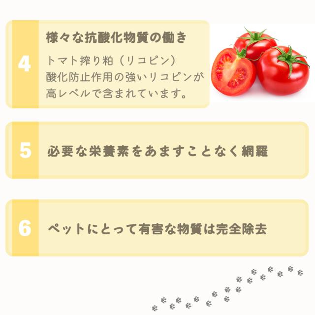 アレルギー、皮膚乾燥、虚弱体質、涙ヤケ、色落ち等の原因につながりやすい合成保存料や着色料、人口添加物、またペットが苦手とするでんぷん質の多い素材(小麦、大豆、とうもろこし)を徹底除去。