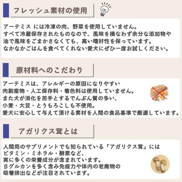 ※アーテミスに関して製造ロットによって粒の色・形状・におい等が変動することがございます。これらは合成着色料・香料不使用、原材料の生産時期の違い、製造時の焼き加減や原材料の水分値により粒の膨張や縮小があること等に起因致します。製品に問題はありませんが、事前に確認が必要な場合はお問い合わせください。