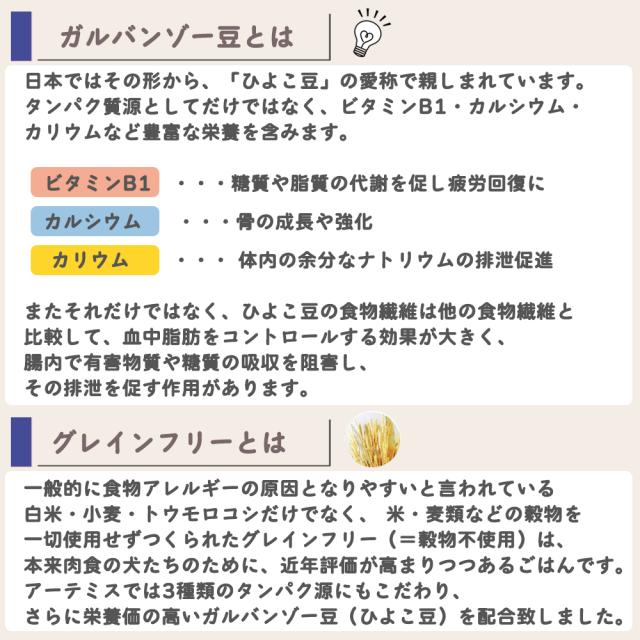 一般的に食物アレルギーの原因となりやすいと言われている白米・小麦・トウモロコシだけでなく、 米・麦類などの穀物を一切使用せずつくられたグレインフリー(=穀物不使用)は、本来肉食の犬たちのために、近年評価が高まりつつあるごはんです。 アーテミスでは3種類のタンパク源にもこだわり、さらに栄養価の高いガルバンゾー豆(ひよこ豆)を配合致しました。