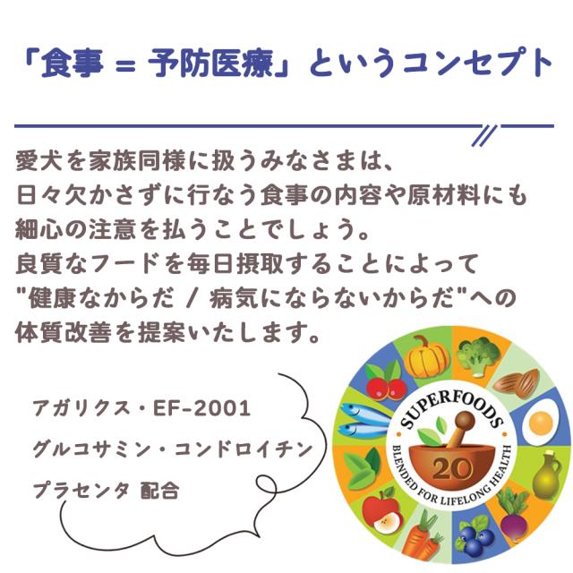 犬が本来持っている免疫力、自己治癒力を大切に考えたプレミアムフードです。話題のアガリクス茸、プラセンタを配合。食生活からも愛犬の健康を考えている方にお薦めの逸品です。肥満気味・減量が必要な成犬、高齢犬用。