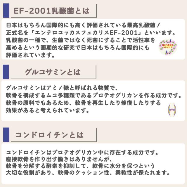 アガリクス茸、EF2001乳酸菌、グルコサミン、コンドロイチン、プラセンタ配合