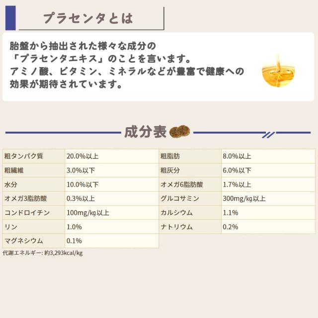全粒玄米、フレッシュチキン、ドライチキン、鶏脂肪(混合トコフェロールによる保存処理)、乾燥ビートパルプ、チキンスープ(天然風味料)、フラックスシード、ドライ魚肉、塩化カリウム、塩、塩化コリン、乾燥チコリ根、L-カルニチン、グルコサミン塩酸塩、ラクトバチルスアシドフィルス菌、ビフィドバクテリウム アニマリス、ラクトバチルスロイテリ、エンテロコッカスフェカリスEF2001、アガリクス、プラセンタ(馬由来)、ビタミンE、キレート鉄、キレート亜鉛、ユッカシジゲラエキス、キレート銅、硫酸第一鉄、硫酸亜鉛、硫酸銅、ヨウ化カリウム、チアミン硝酸塩、キレートマンガン、酸化マンガン、コンドロイチン硫酸、アスコルビン酸、ビタミンA、ビオチン、ナイアシン、パントテン酸カルシウム、硫酸マンガン、亜セレン酸ナトリウム、ピリドキシン塩酸塩(ビタミンB6)、ビタミンB12、リボフラビン、ビタミンD、葉酸